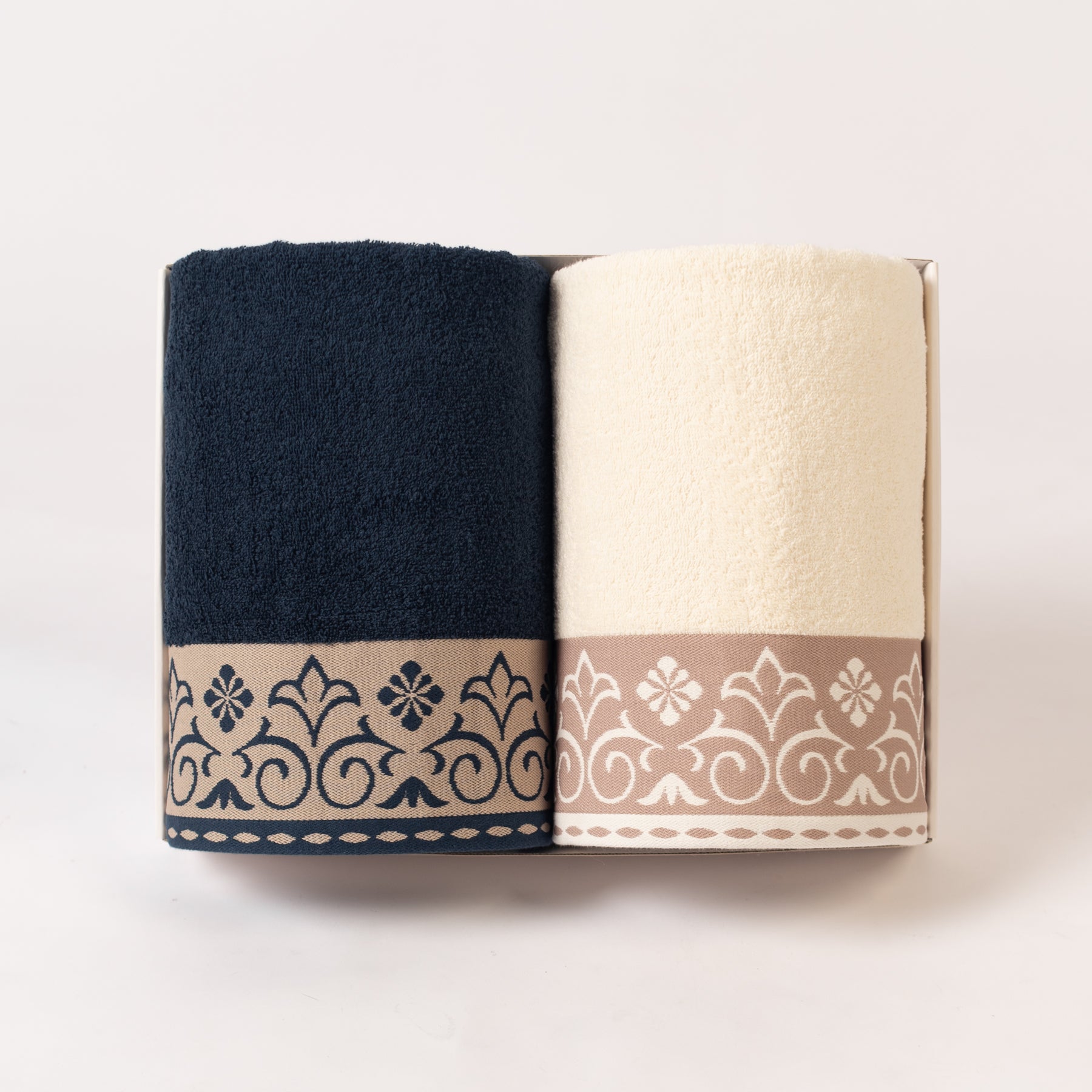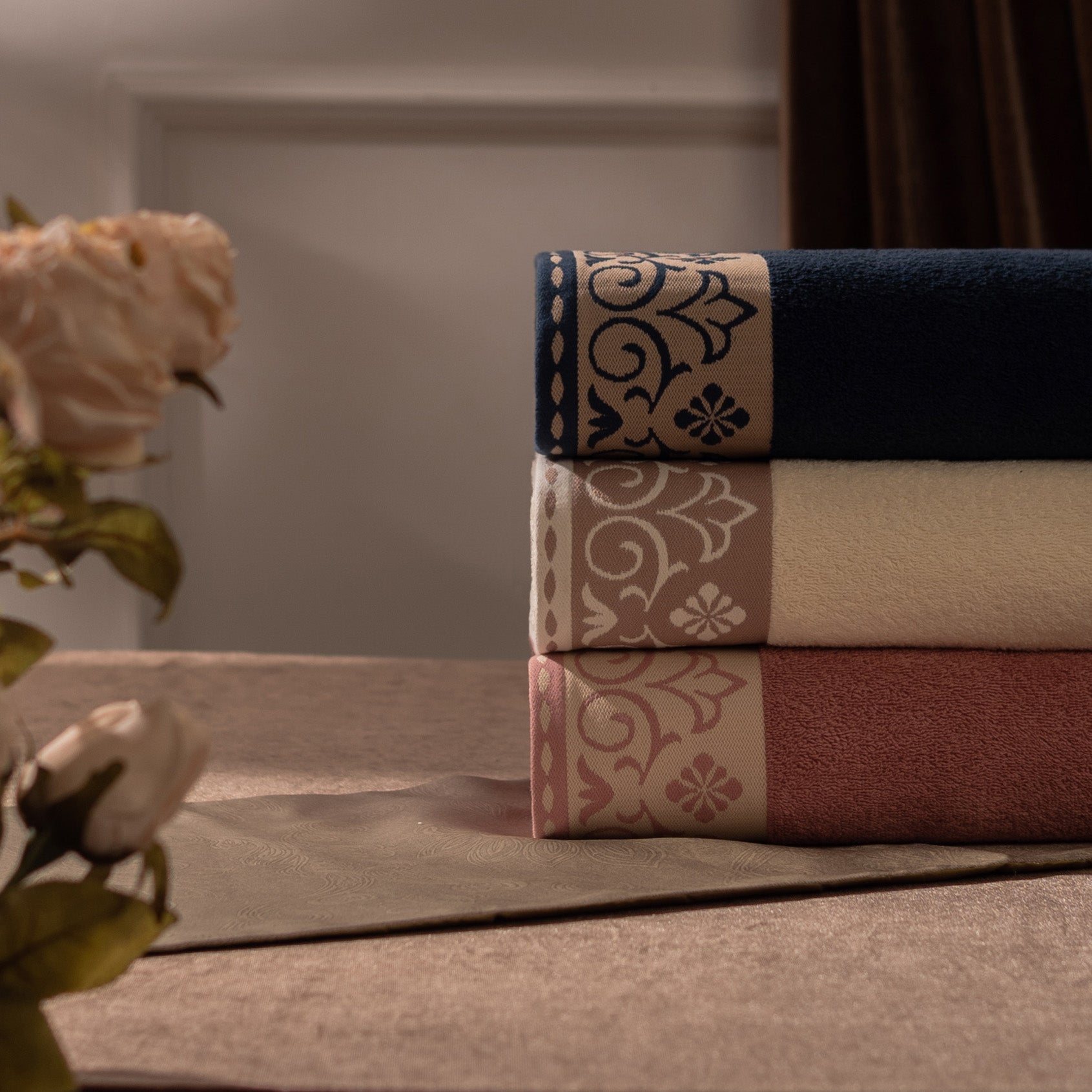 The Athena Couple Towel features Rococo-style motifs with elegant, gently curved lines. Its graceful strokes are beautifully rendered in a royal trio of colors, crafted from soft and skin-friendly material—making it a thoughtful gift for your loved ones.