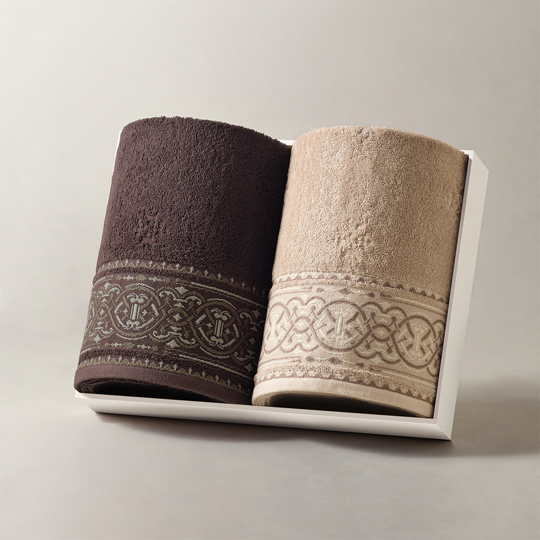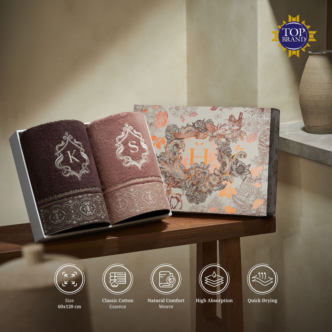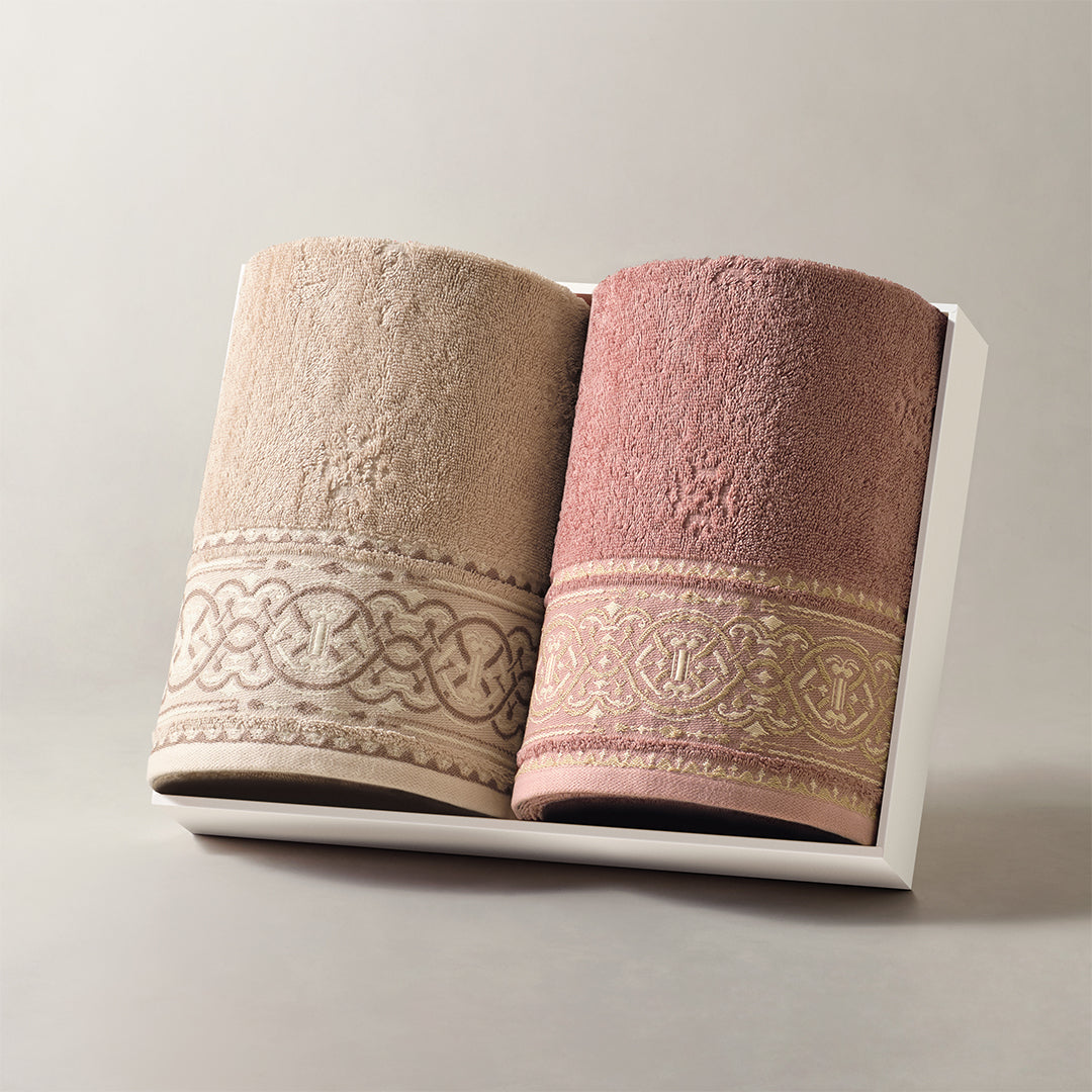 Designed with detailed pillar accents and intricate ornaments, the Astara Couple Towel is a meaningful and practical gift for special moments. Its luxurious motif pairs beautifully with warm neutral tones. Perfect for gifting to couples, friends, family members, or parents—especially with personalized name or initial embroidery.