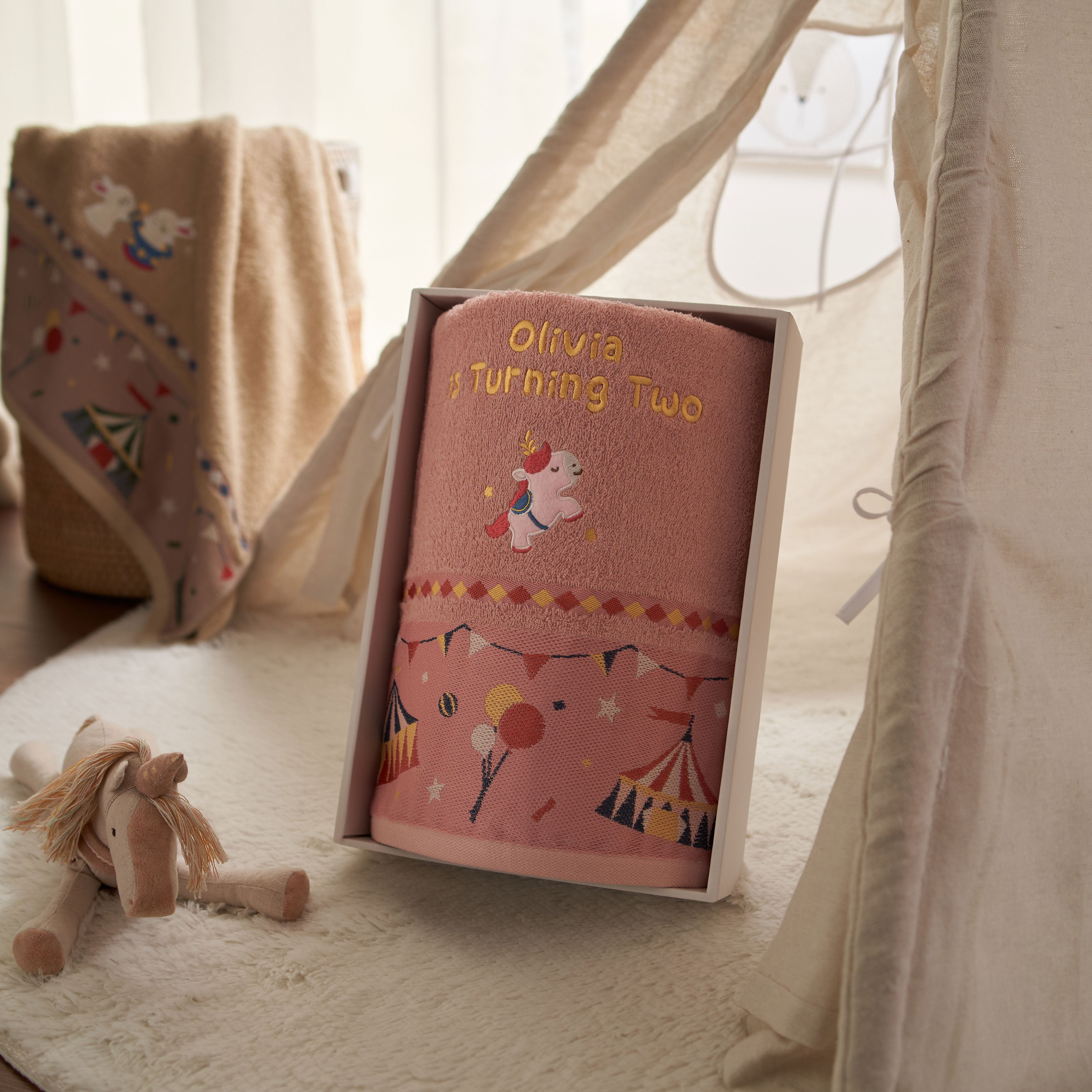 Celebrate your little one’s special day with a whimsical gift from Wonderville’s Fantasy Parade. Featuring three adorable circus characters, this towel set turns everyday bath time into a fun and joyful experience. Add a personal touch with custom embroidery of their name or a sweet message to make the gift even more memorable.
