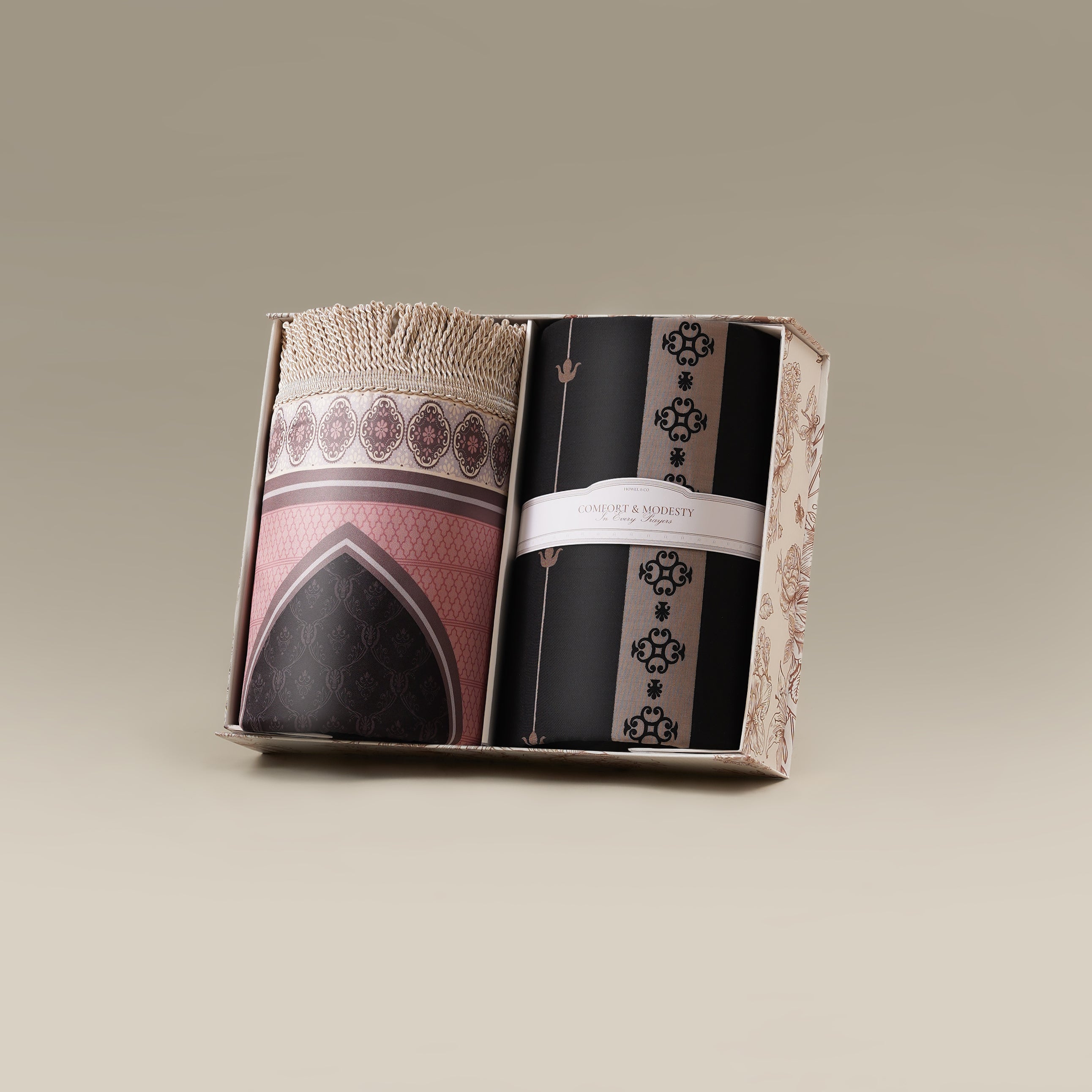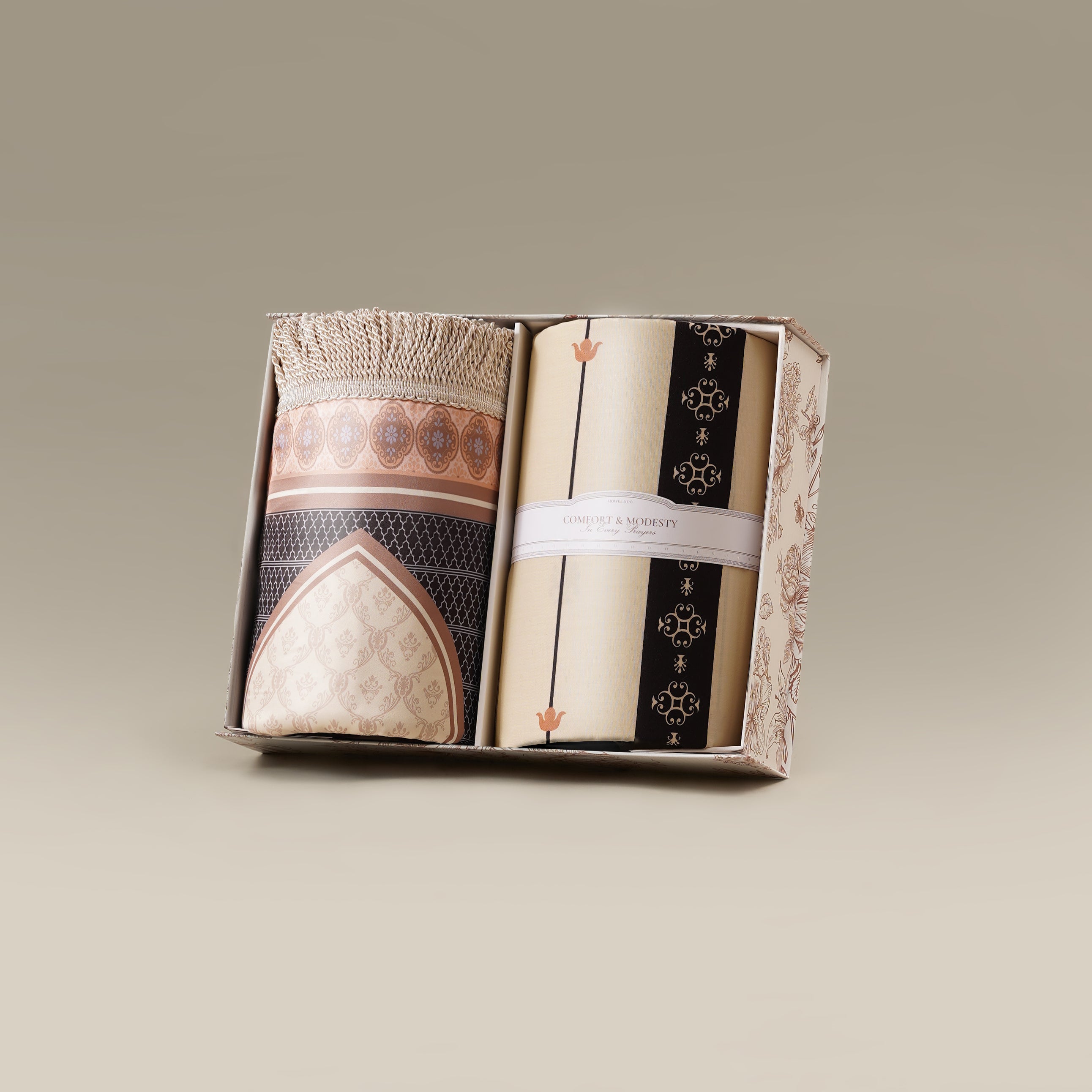 - Refined Textures, Elevated Comfort: A soft prayer mat paired with a lightweight structured sarong for a calming and immersive prayer experience.