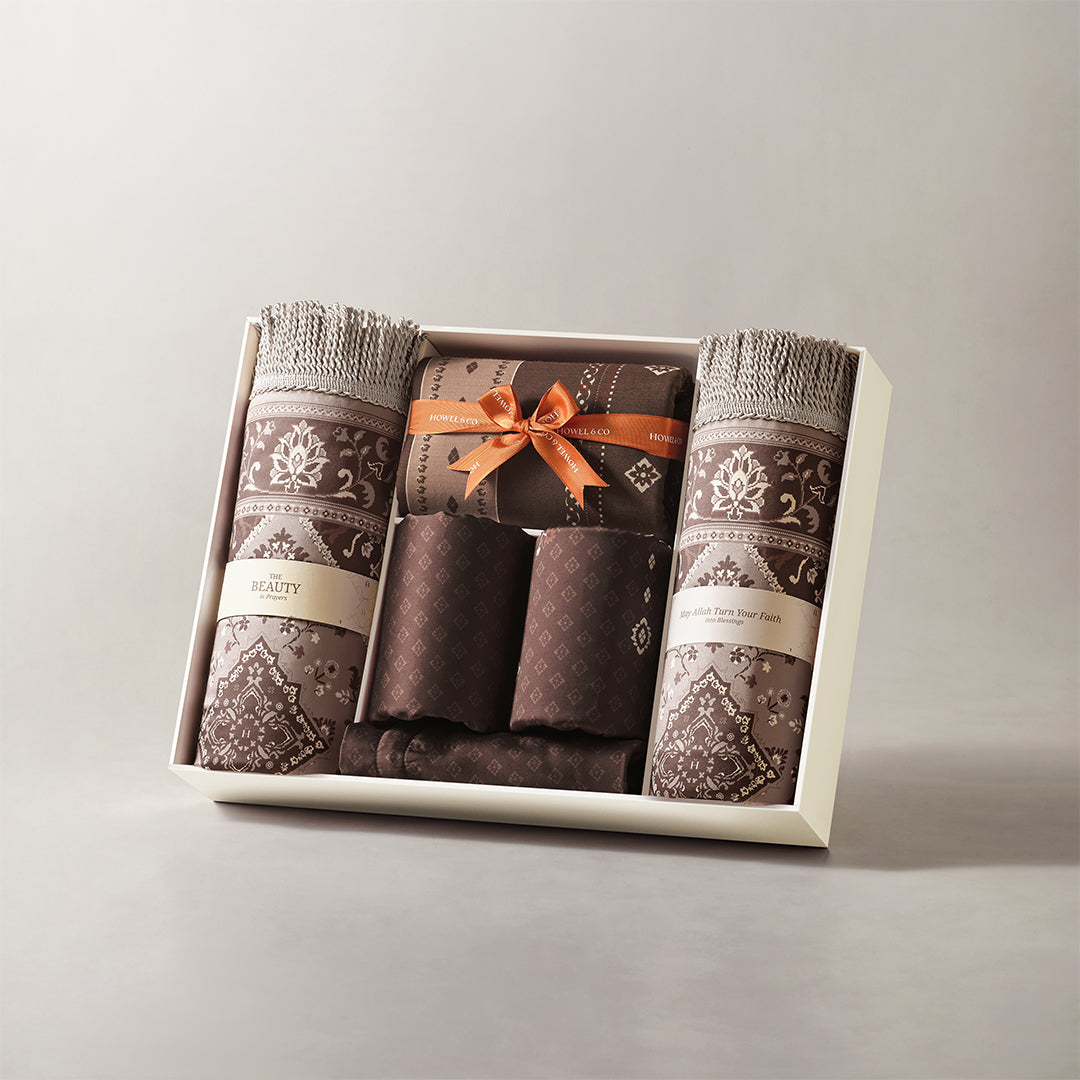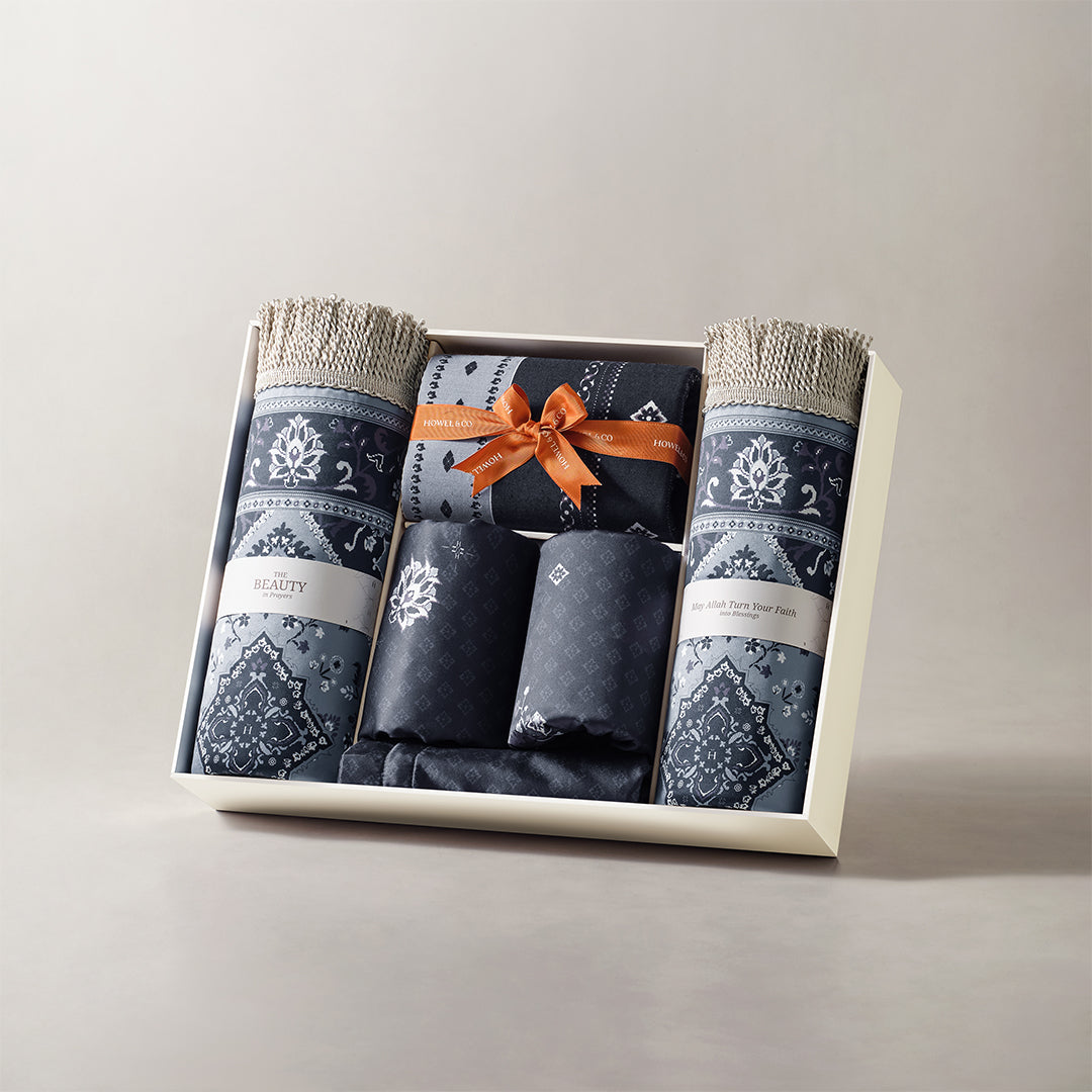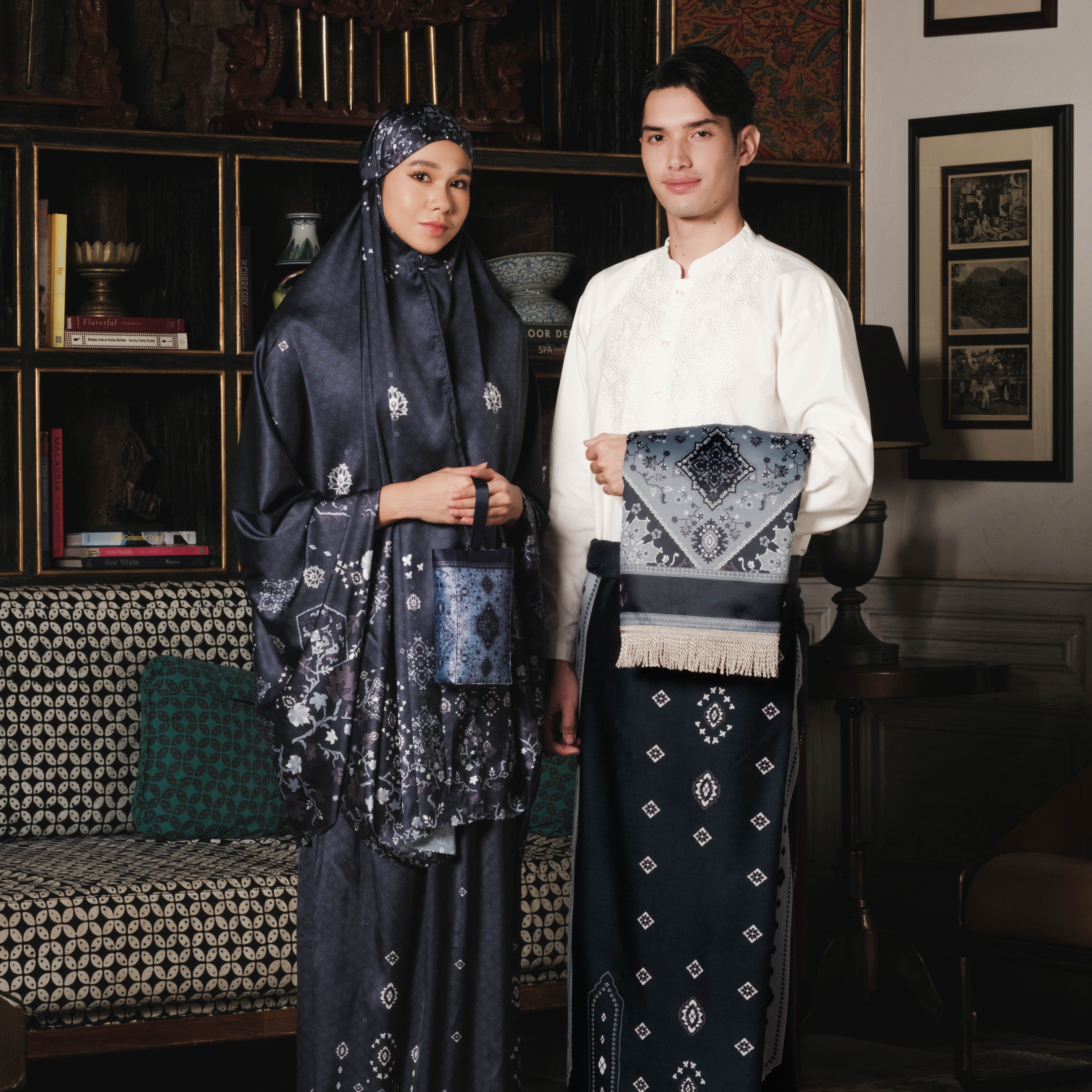 Complete the celebration with the Shireen Grand Royal Set, the most luxurious and complete gift from the Shireen collection. This 4-in-1 prayer set for both women and men includes a premium prayer mat set, sarong, and mukena—beautifully crafted with high-quality materials. Available in three classic color options, each piece features curated ornamental floral designs by Howel & Co, making it a truly meaningful and elegant gift.