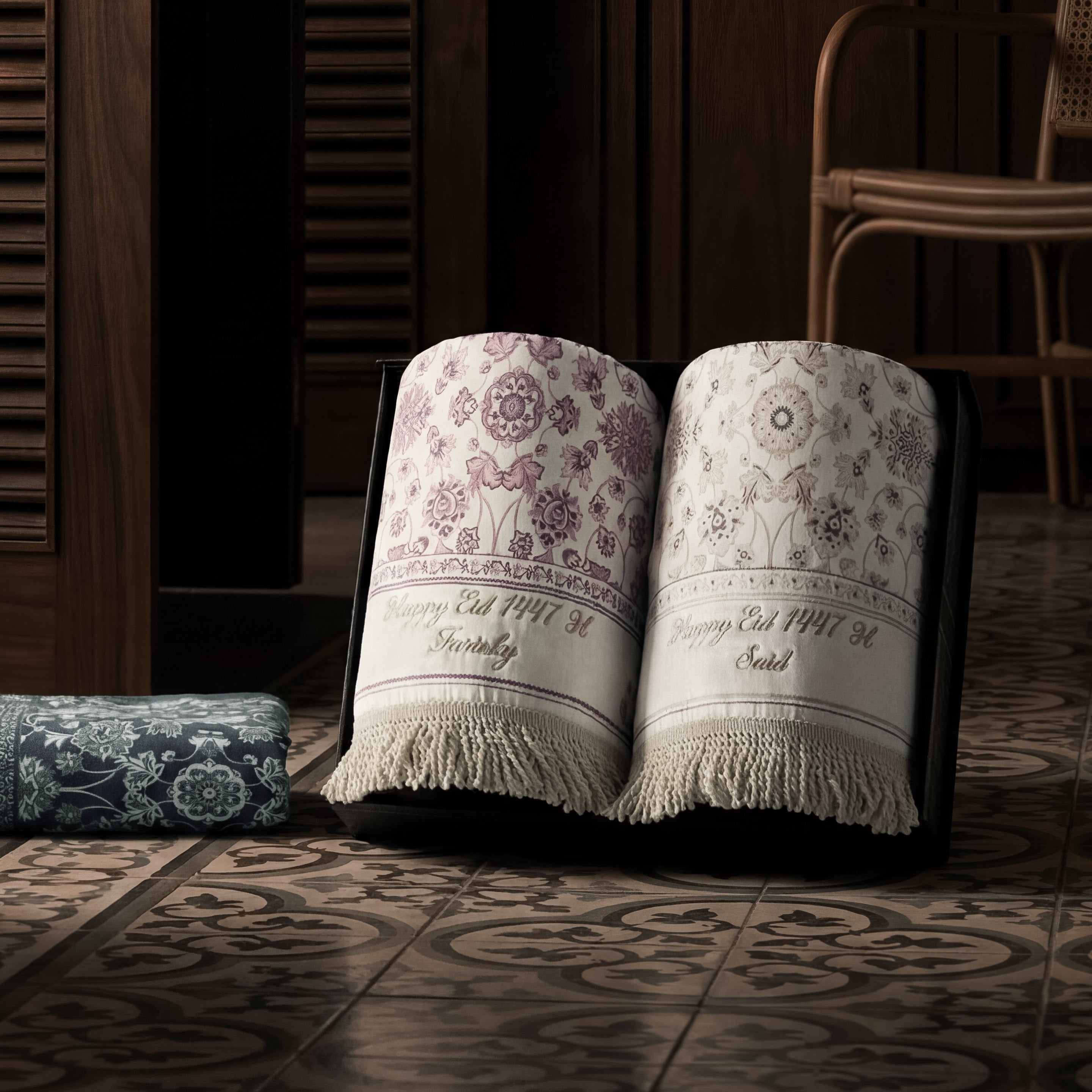 Complete your loved one's special moment with the thoughtful Couple Prayer Mat Enoura. This 2-in-1 prayer mat set features soft floral and vine motifs, crafted from premium materials curated by Howel & Co. Mix and match your favorite color combinations and personalize each mat with embroidered initials or names to create a gift that’s truly heartfelt and memorable.