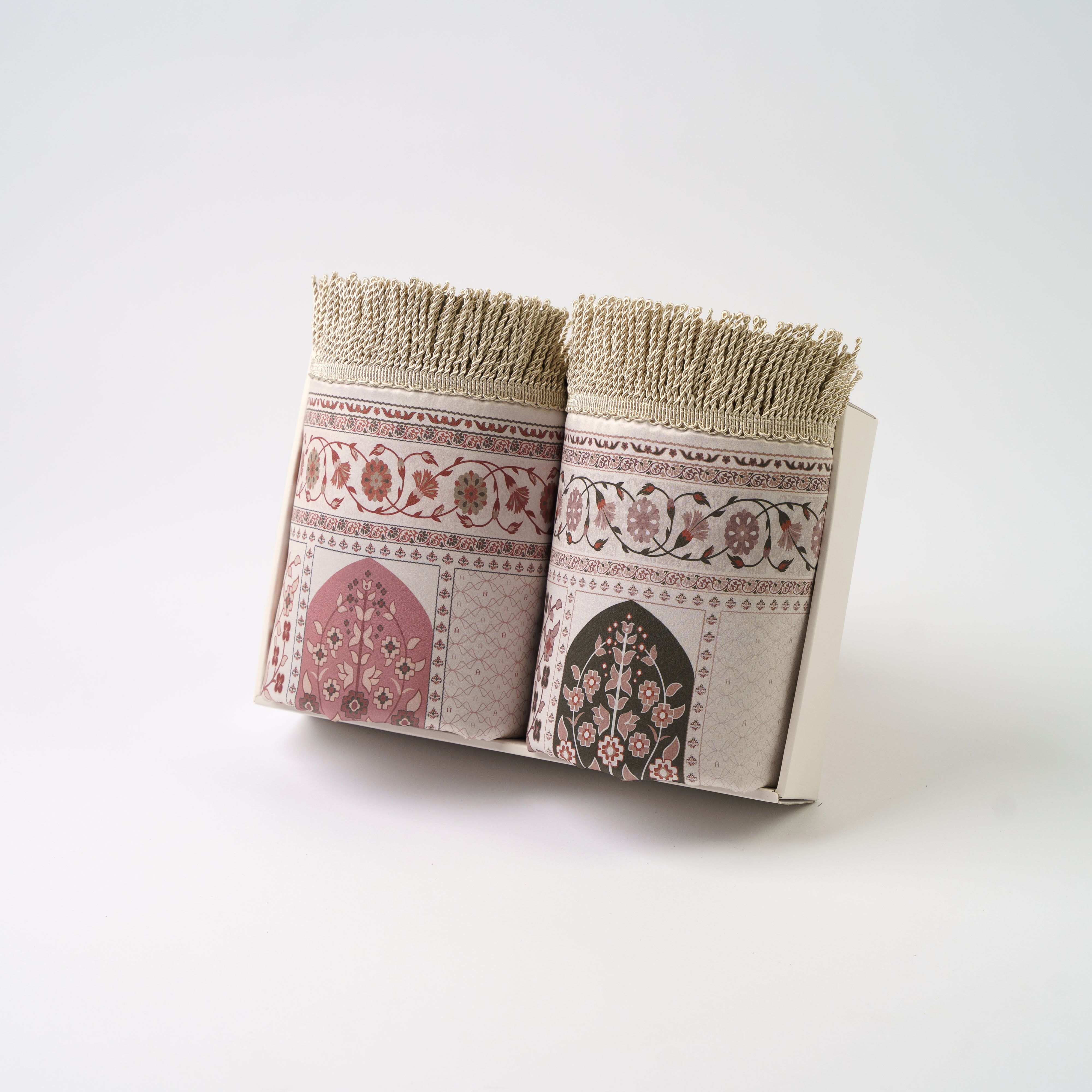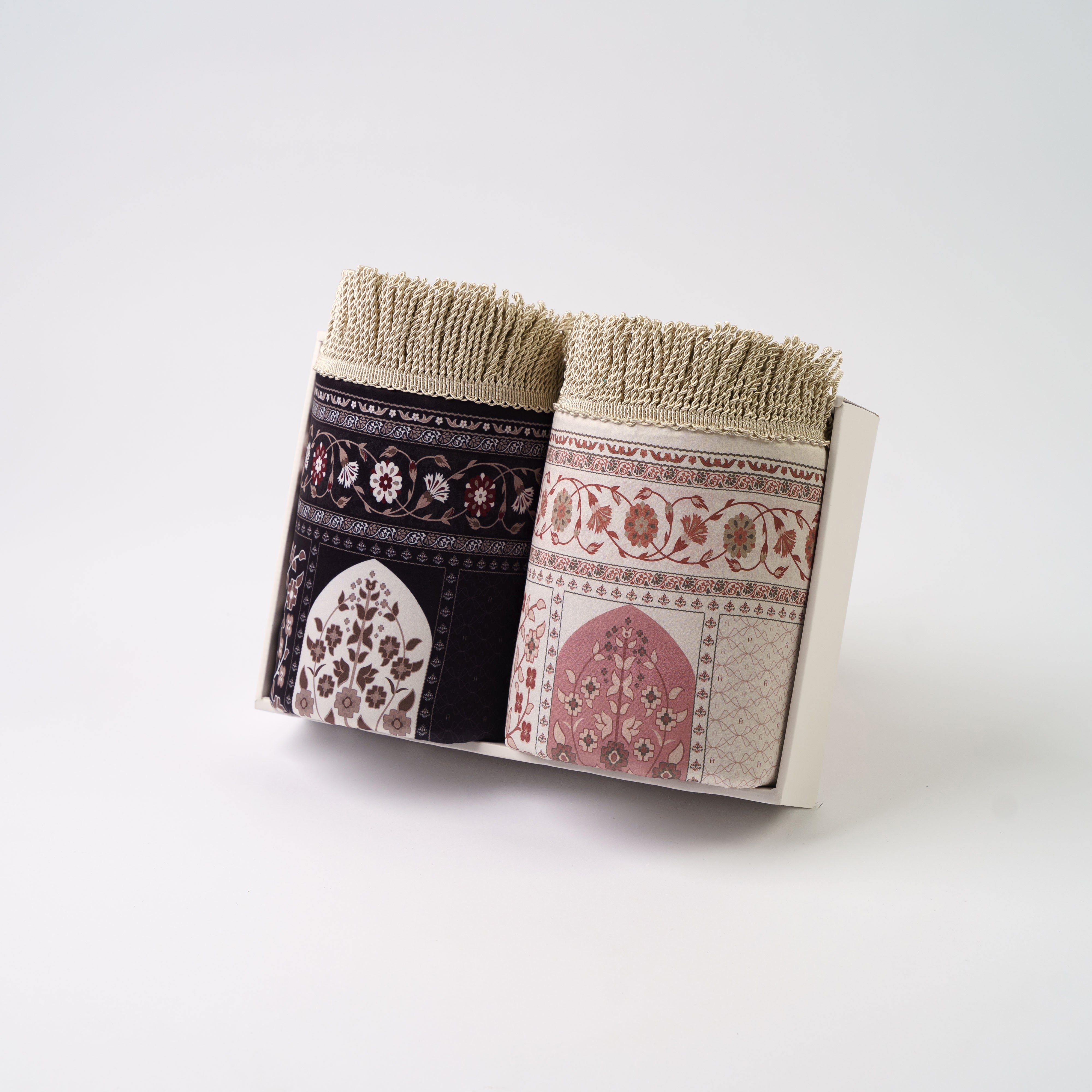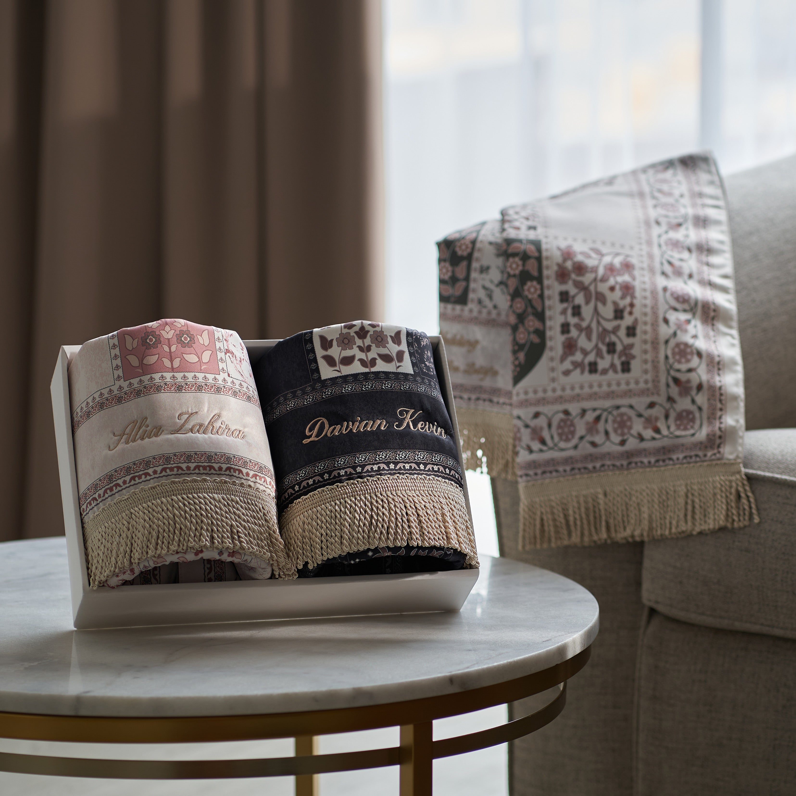 Designed with charming Damask-style eternal garden motifs, the Halwa Couple Prayer Mat Set is a meaningful and practical gift for daily prayer rituals. It includes two prayer mats in complementary favorite colors, complete with exclusive pouches for ease and convenience. Add a personalized embroidery with initials or names to make your gift even more heartfelt and memorable.