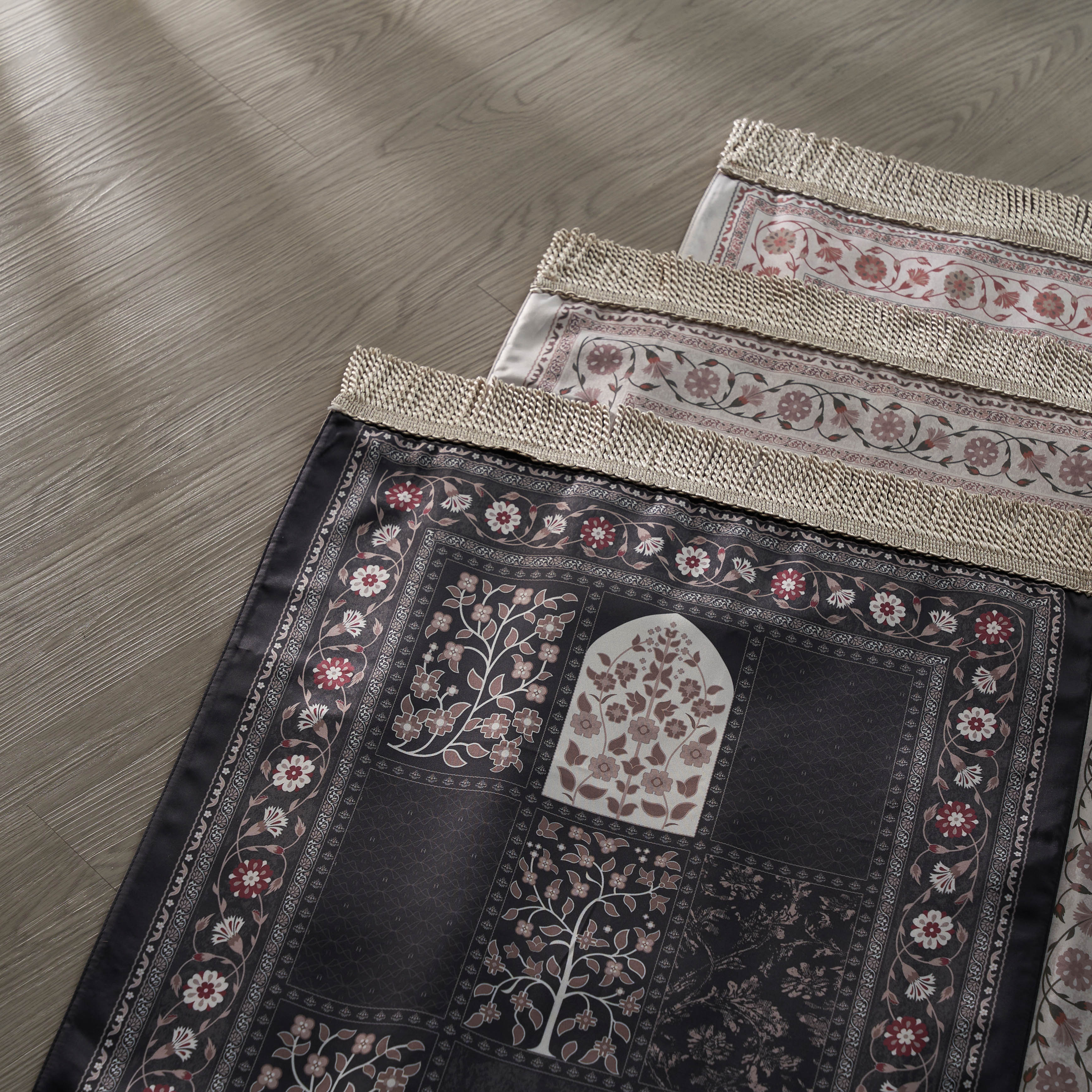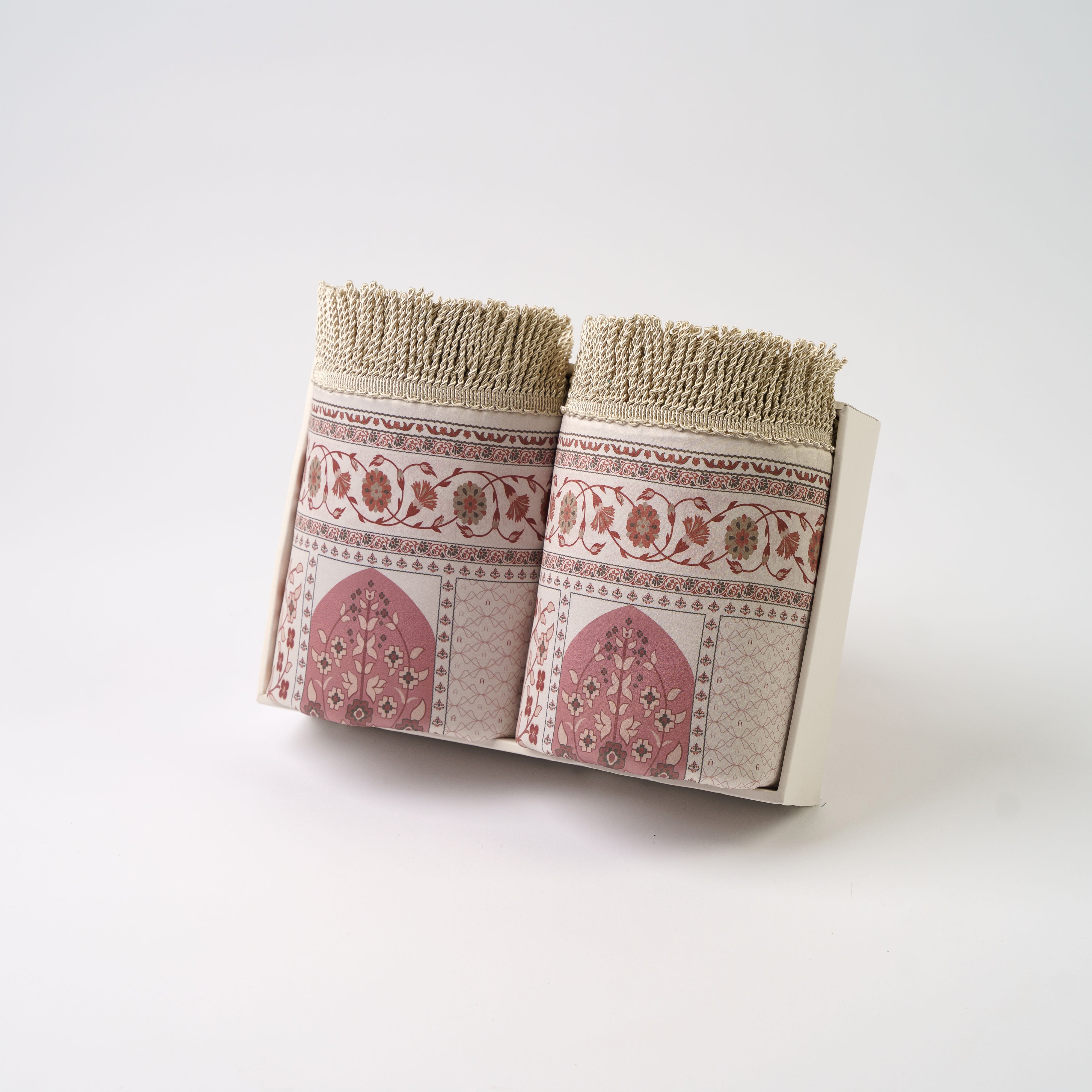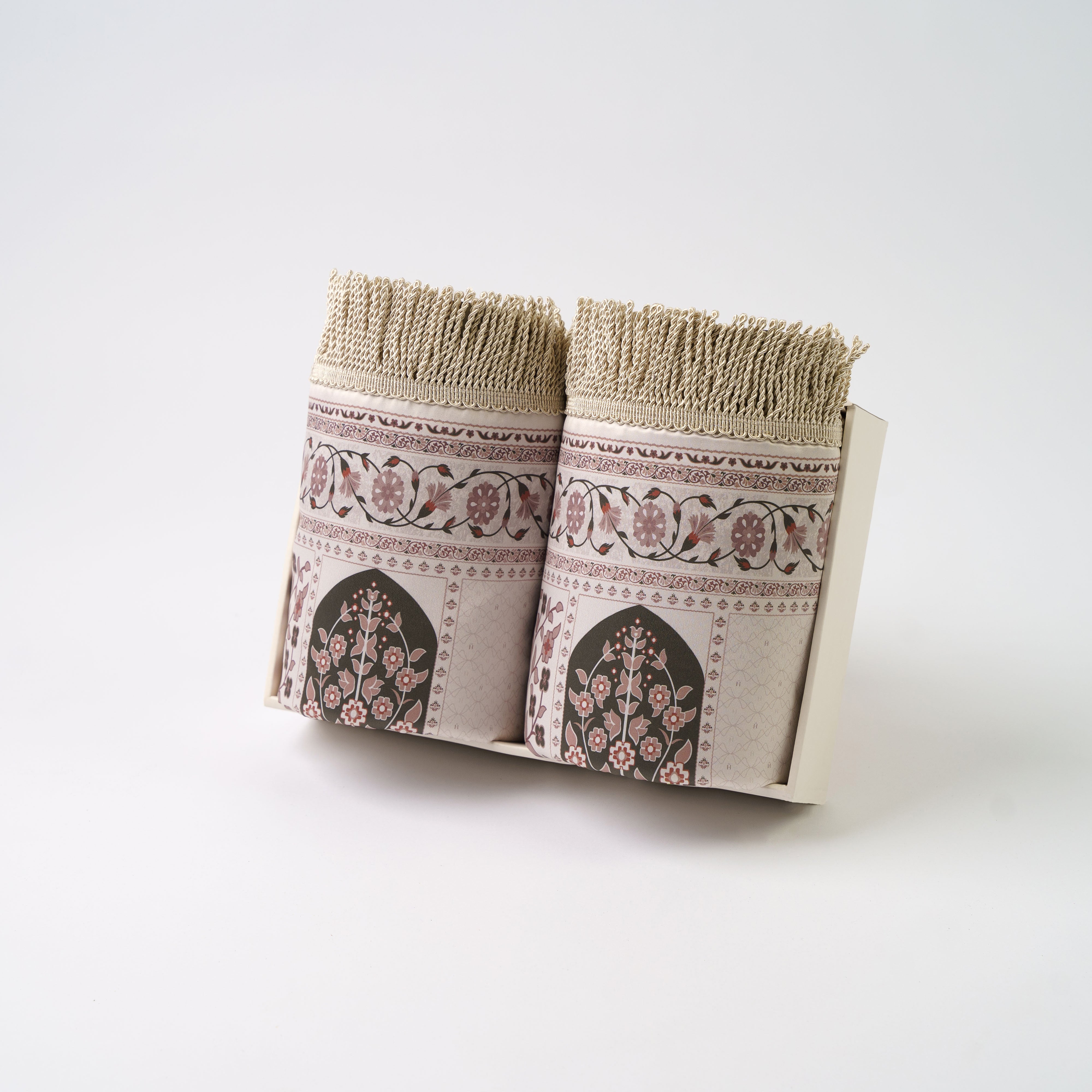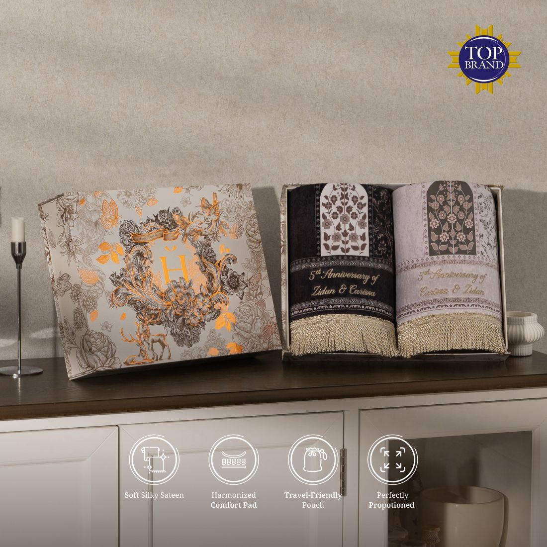 Designed with charming Damask-style eternal garden motifs, the Halwa Couple Prayer Mat Set is a meaningful and practical gift for daily prayer rituals. It includes two prayer mats in complementary favorite colors, complete with exclusive pouches for ease and convenience. Add a personalized embroidery with initials or names to make your gift even more heartfelt and memorable.