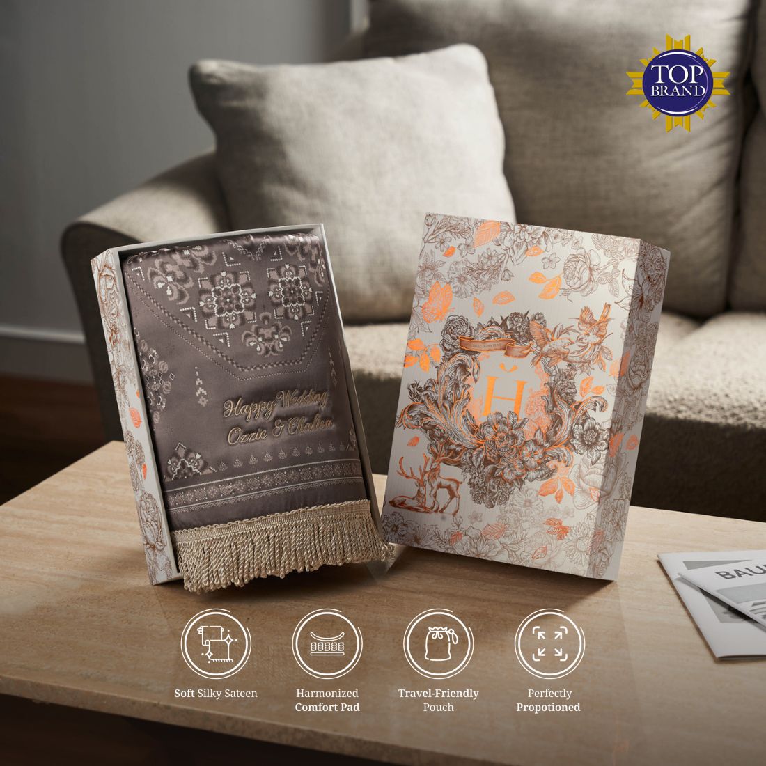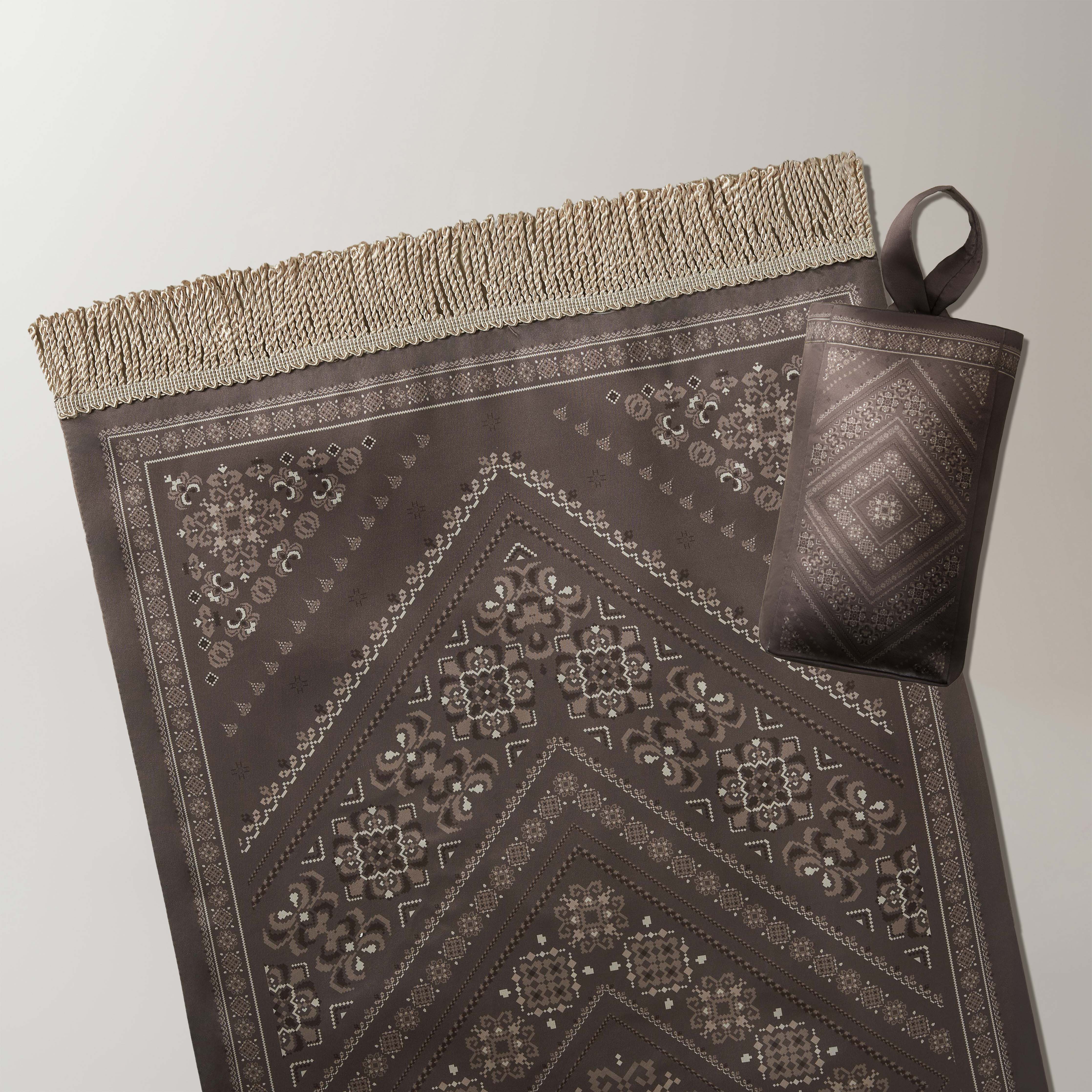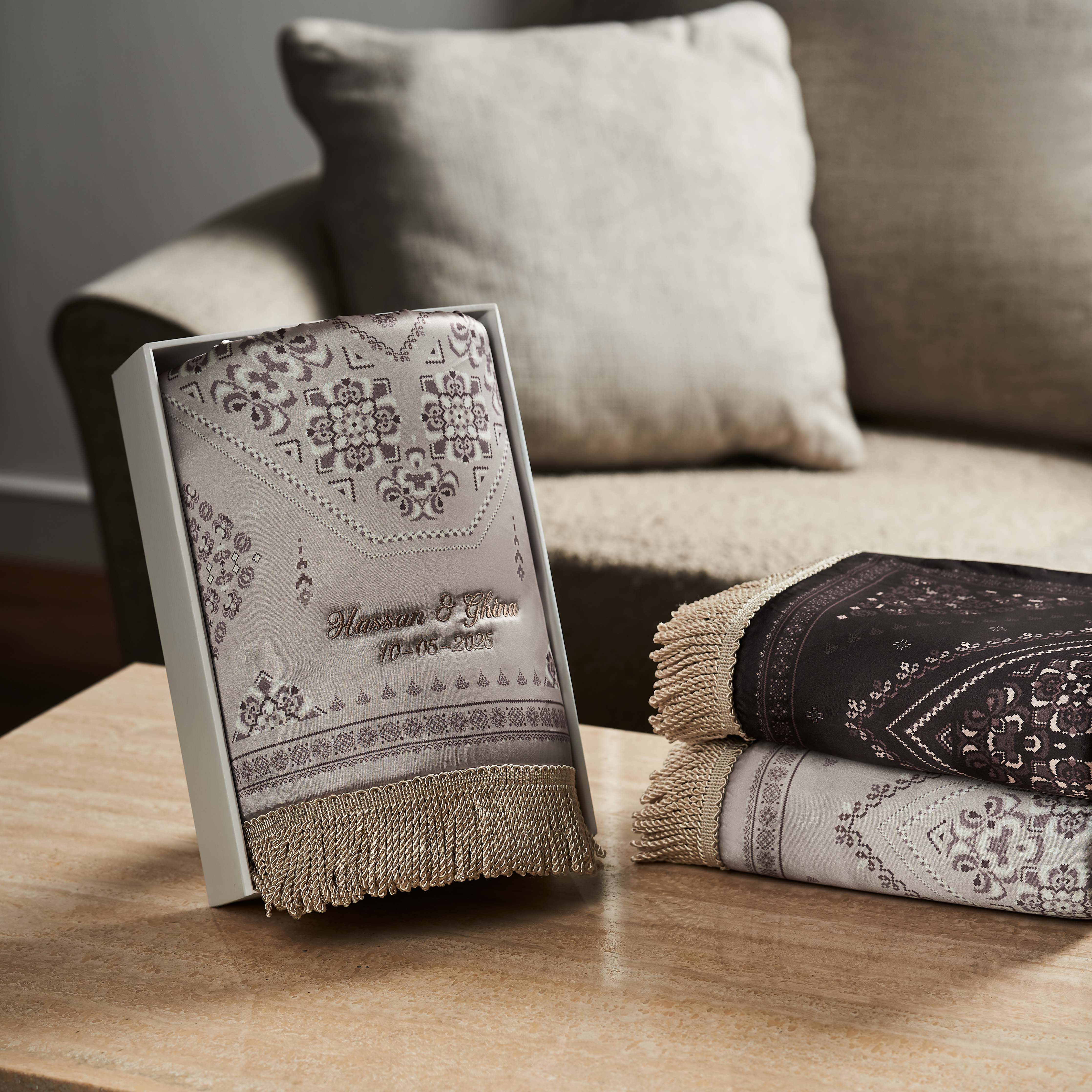 The Ankara Single Prayer Mat features a distinctive diamond pattern inspired by classic Islamic ornaments, with intricate symmetrical detailing. Available in three warm brown-toned color options, it can be personalized with a custom embroidery at the bottom for a thoughtful touch. A meaningful and practical gift choice for celebrating life’s special moments with your loved ones.