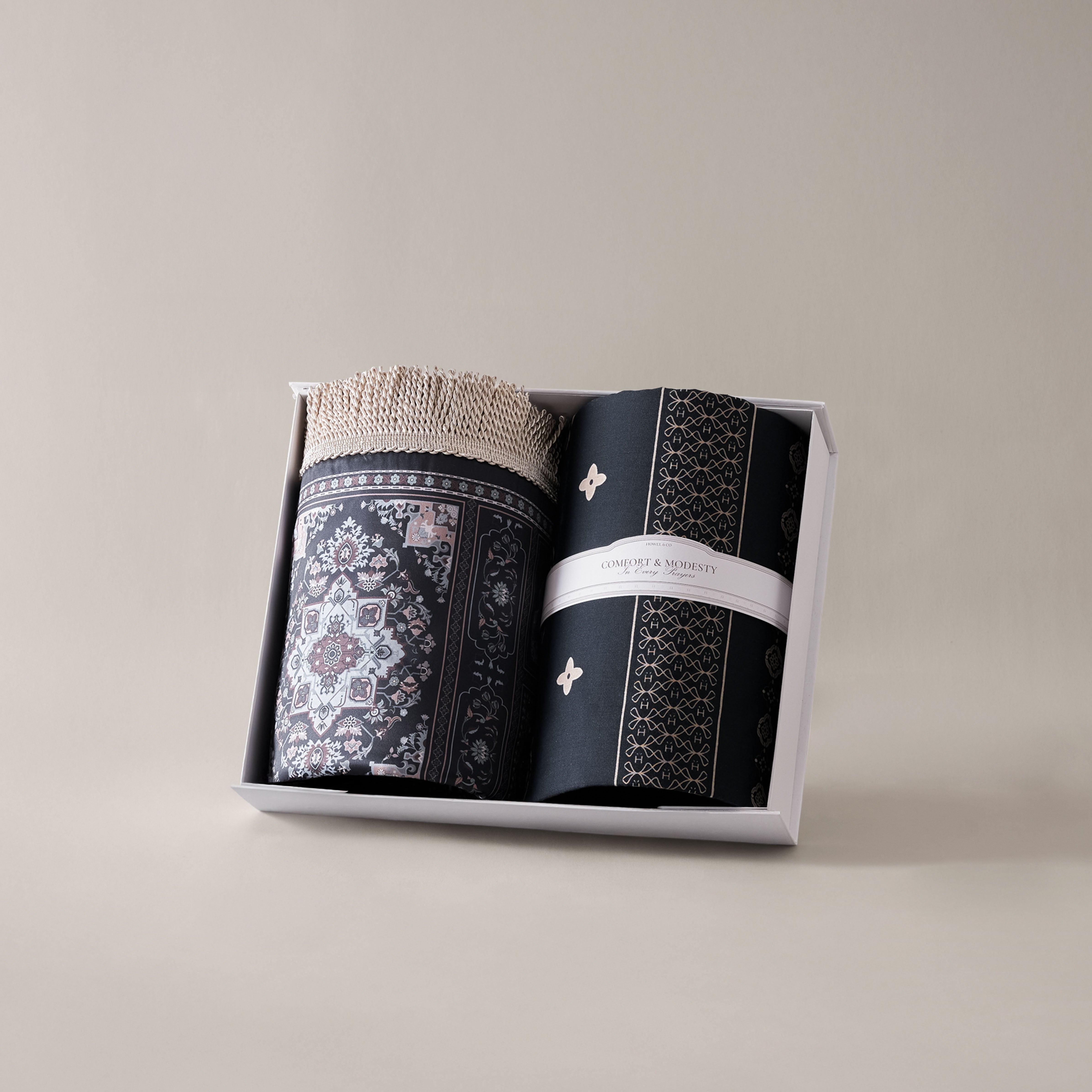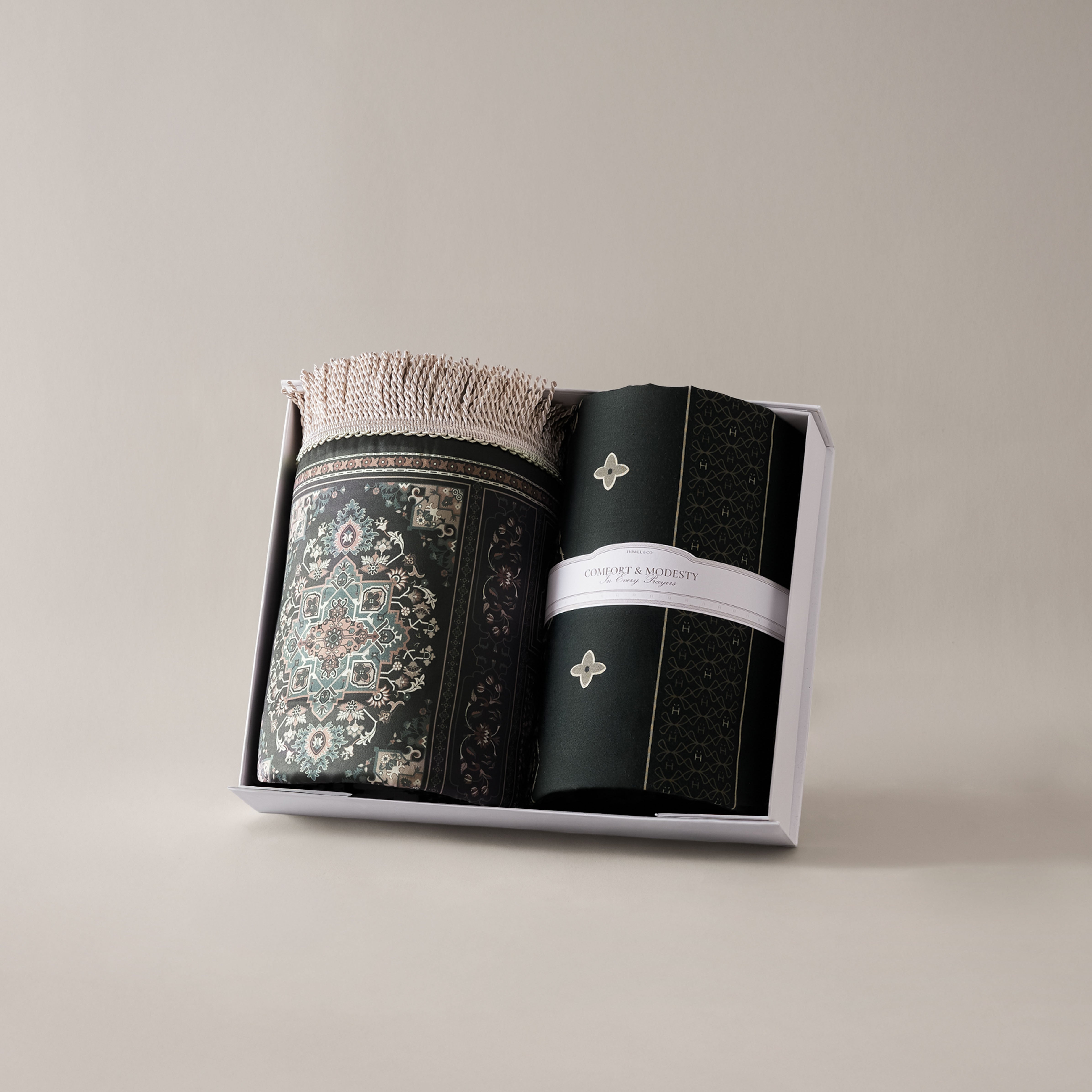 - Refined Textures, Elevated Comfort: A soft prayer mat paired with a lightweight structured sarong for a calming and immersive prayer experience.