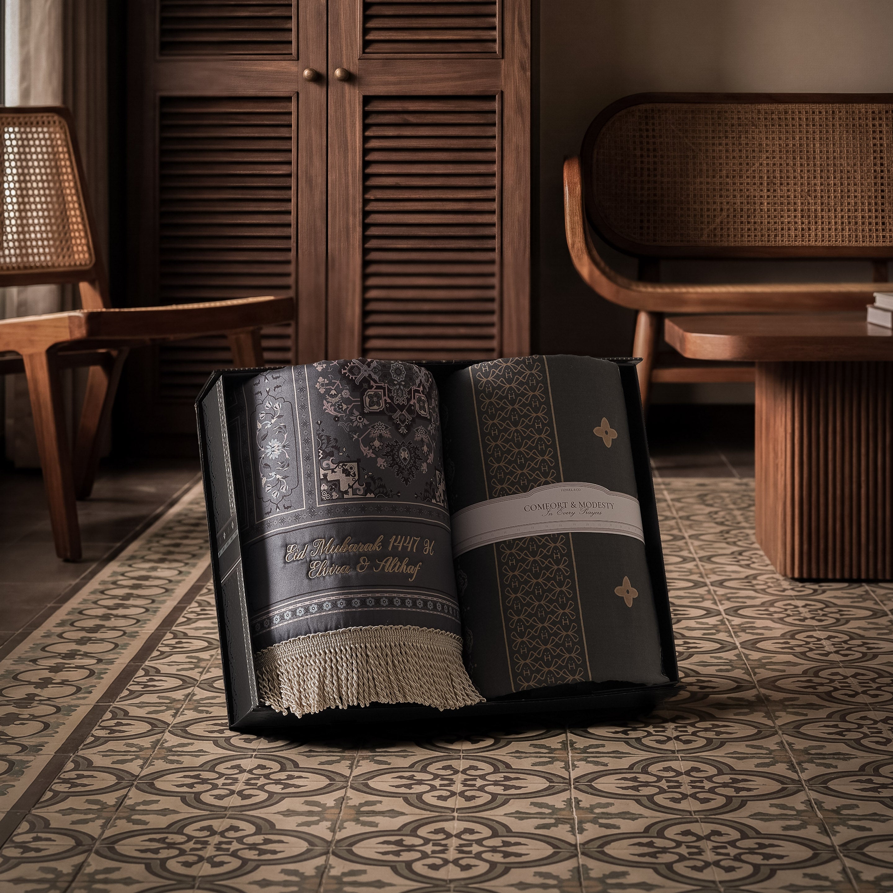 Lioren Classic Man is a prayer set consisting of a prayer mat and sarong, designed with a refined and masculine character. Calming tones and classic details offer comfort and versatility, making it a thoughtful choice for colleagues or partners.