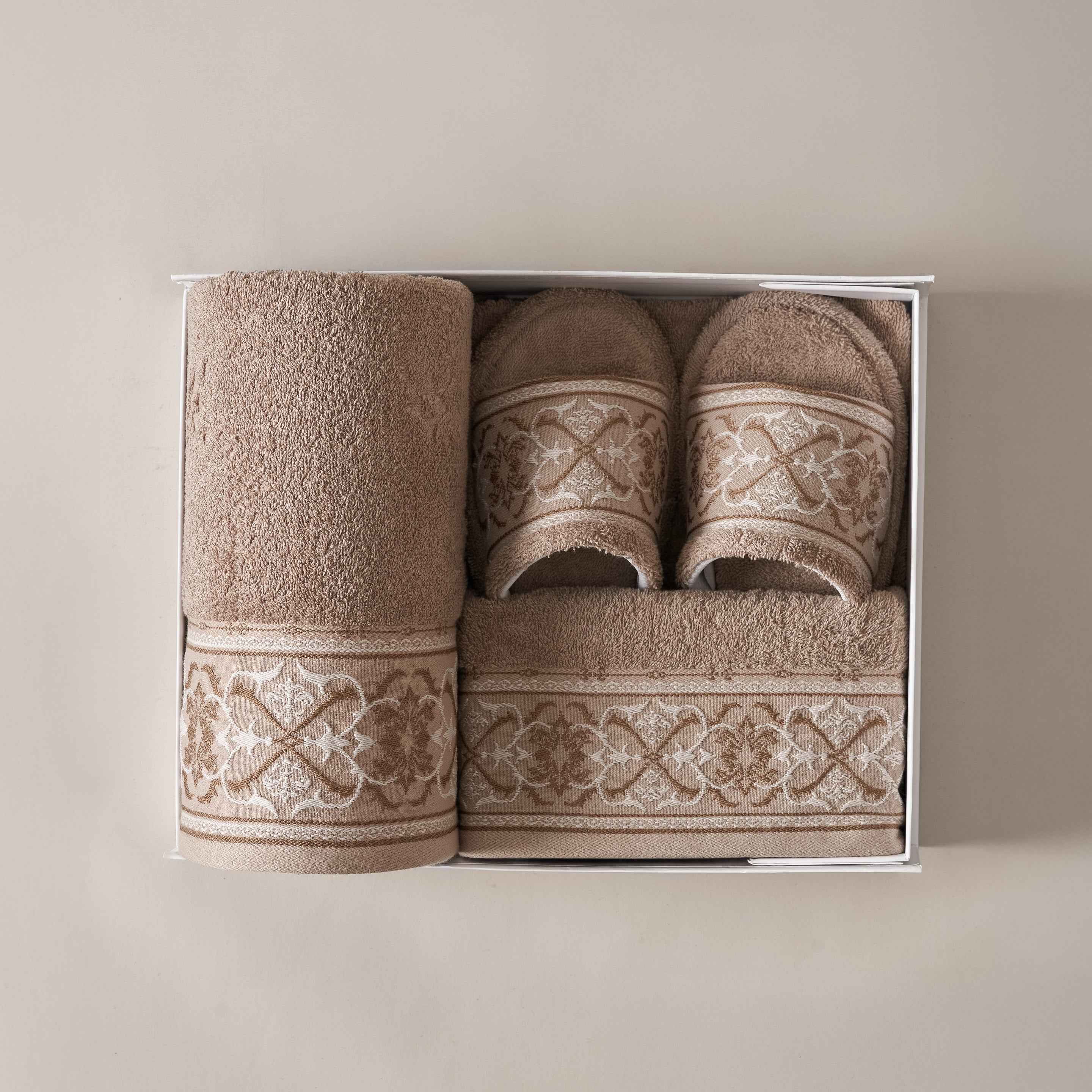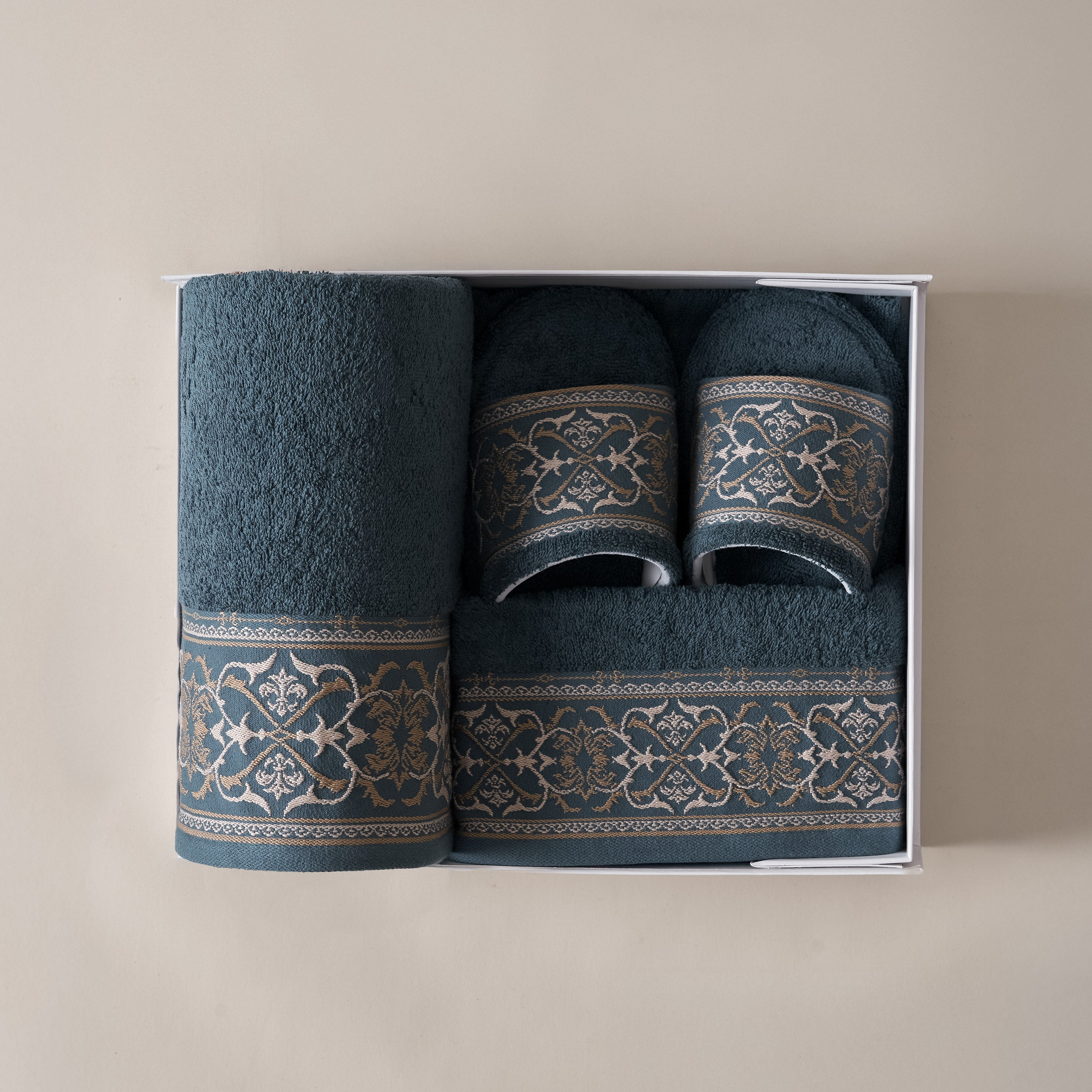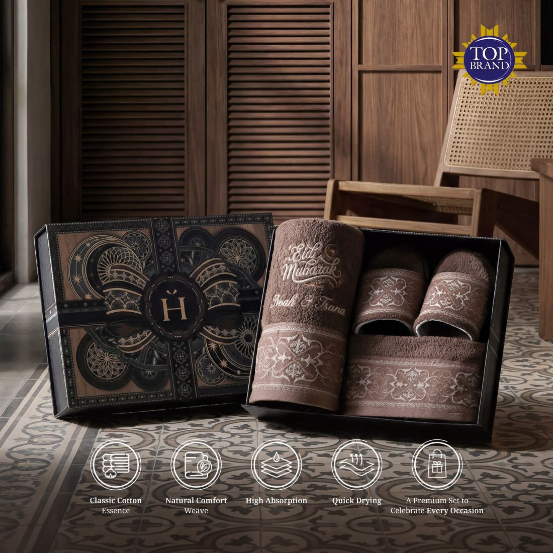 Elvara Premium Set brings together everyday essentials in a well-balanced set: 1 bath towel, 1 sport towel, 1 hand towel, and 1 pair of premium slippers. Carefully considered in both function and design, each piece offers comfort with a refined finish—making it a thoughtful Ramadan gift for family, friends, or colleagues.