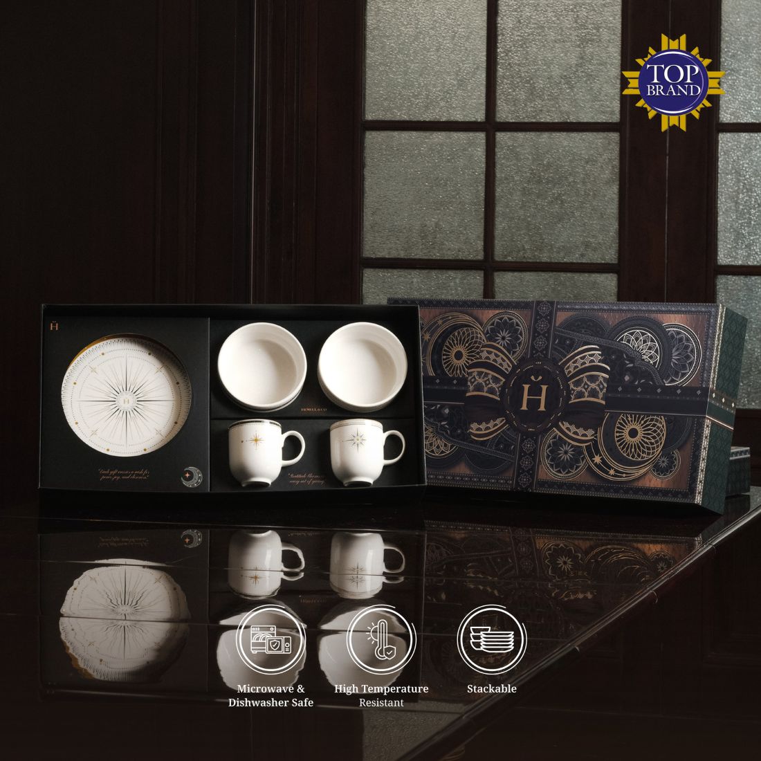Celebrate Eid through moments of togetherness with the Eloura Tableware Collection. Adorned with gilded moon and star motifs, radiant cosmic details, and luxurious symmetrical patterns, Eloura brings elegance to every table setting. Thoughtfully designed for festive gatherings, it transforms shared meals into meaningful Raya moments with family and loved ones.