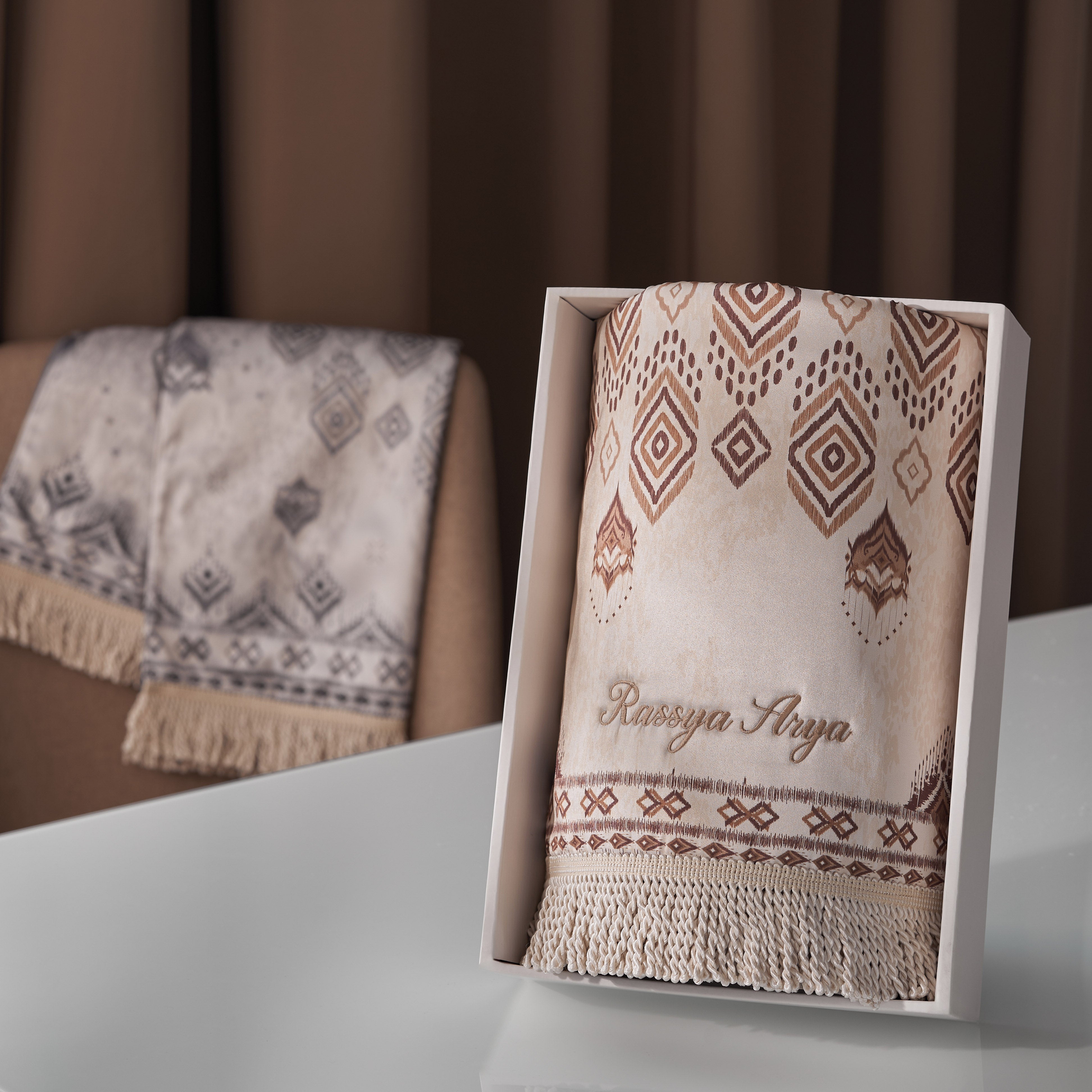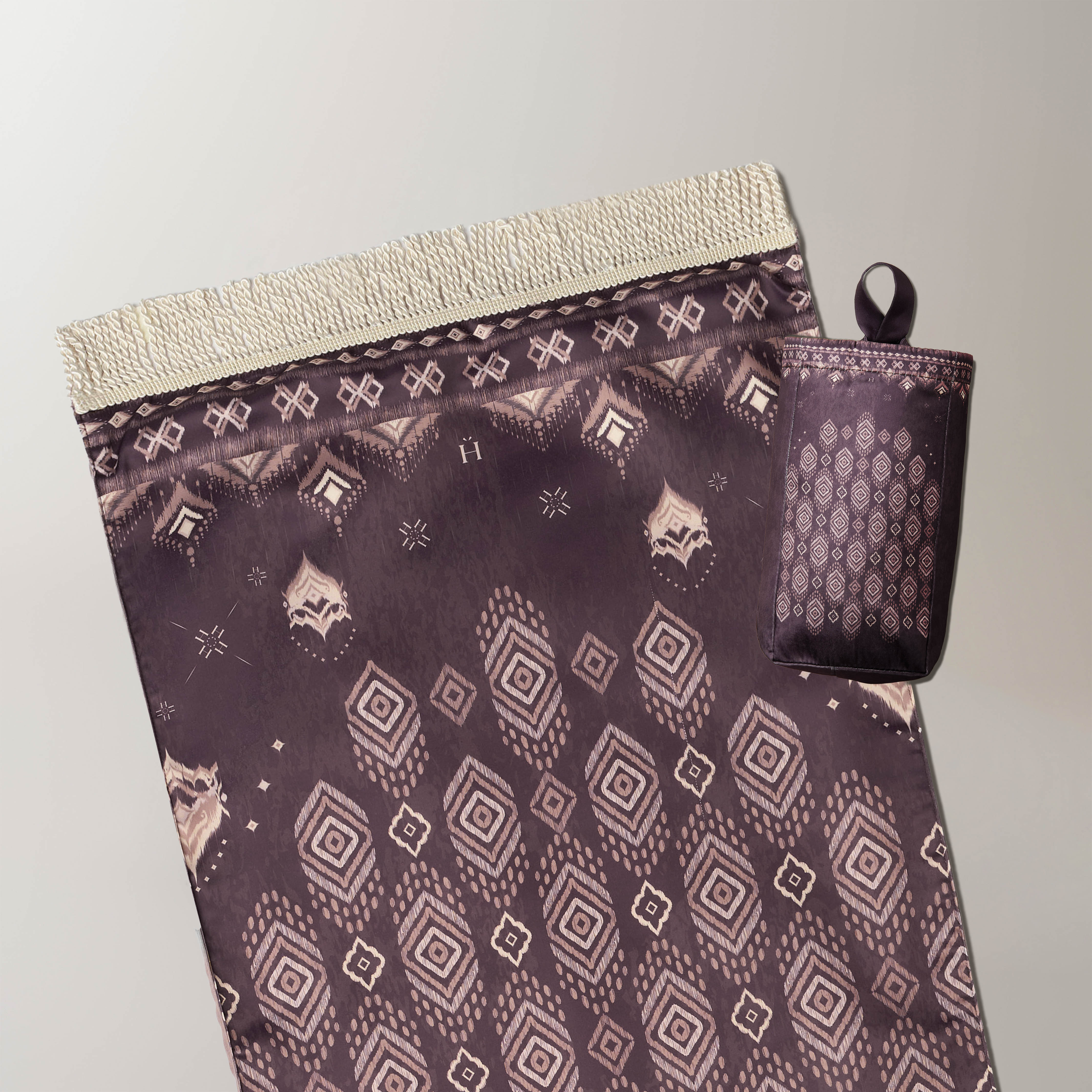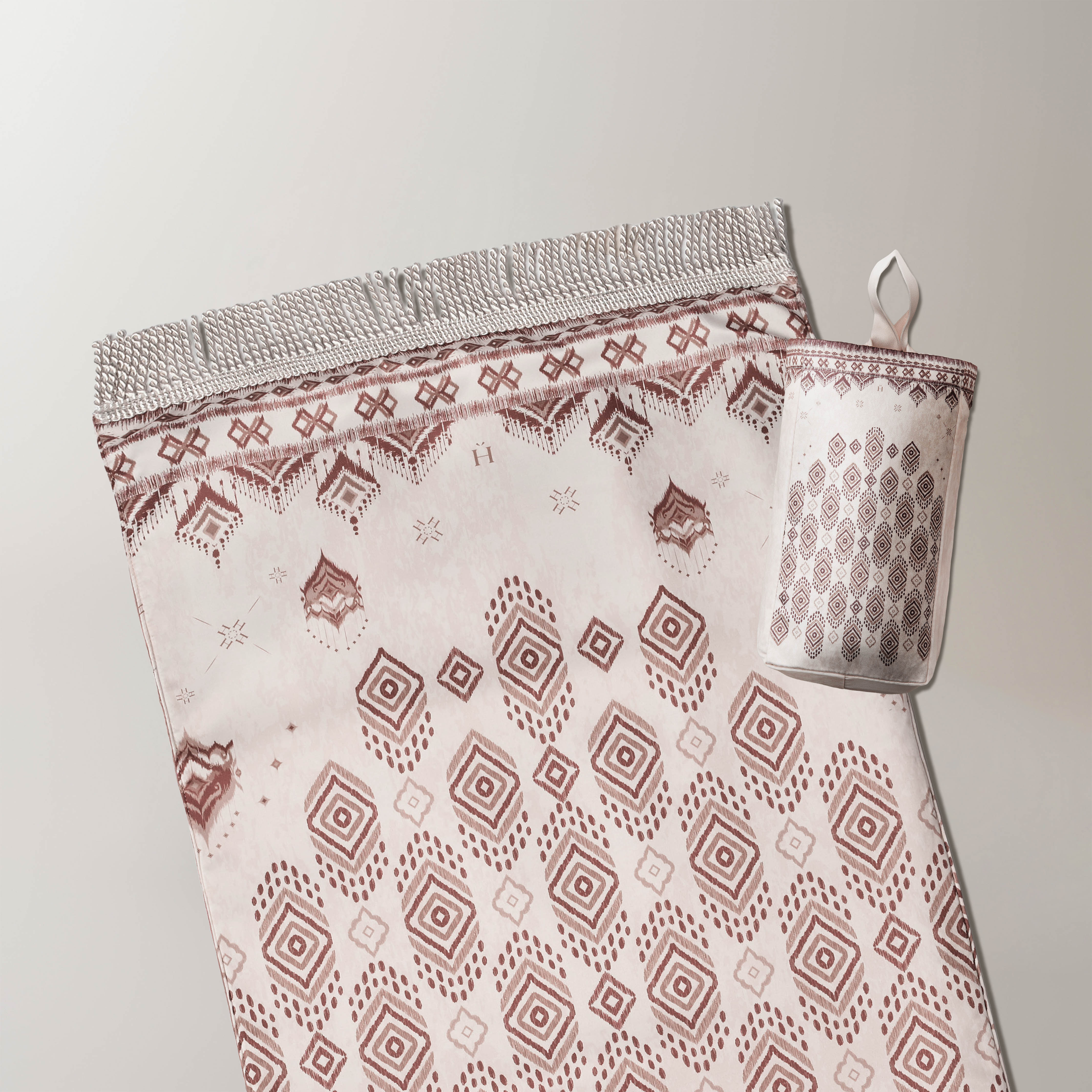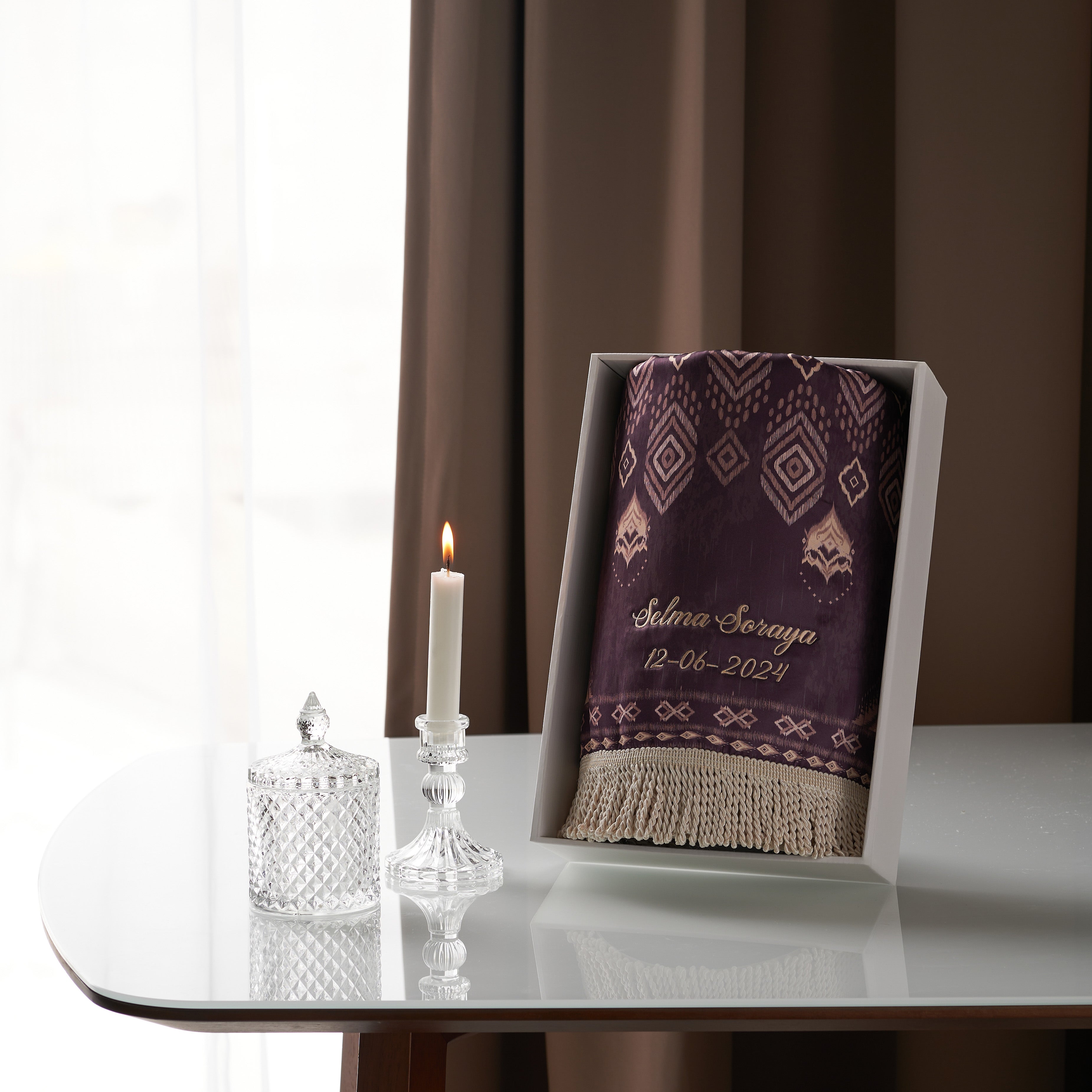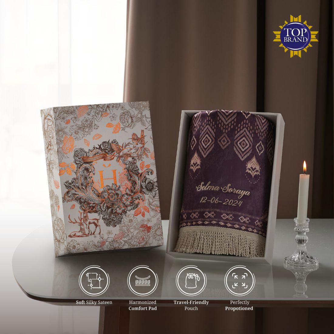 The Zayan Single Prayer Mat features a special ikat-inspired motif and elegant color options. Soft, comfortable, and easy to carry with its exclusive pouch—perfect for travel. Add a personalized embroidery with a heartfelt message as a gift, or include names and dates to create a meaningful wedding keepsake.